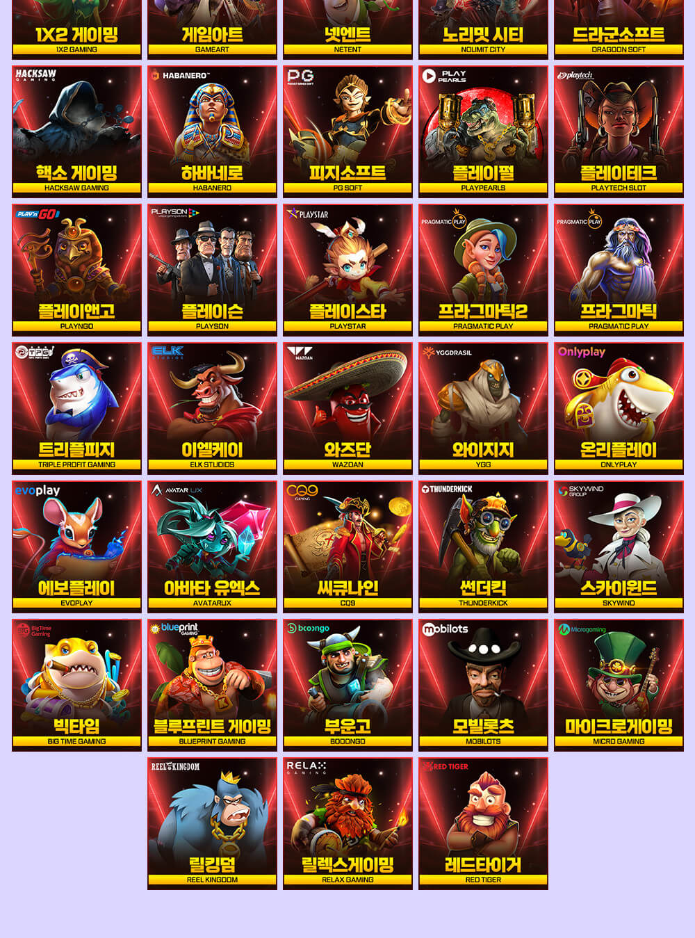 카지노 슬롯 : 프라그마틱슬롯(PragmaticPlay), 에보플레이(EVOPLAY), 시큐9(CQ9), 부운고(Booongo), 와즈단(Wazdan), 플레이스타(PlayStar), 하바네로(Habanero), 릴렉스(Relax), 트리플로필(Triple Profit), 게임아트(GameArt), PG소프트(PG Soft), 블루프린트(Blueprint), 썬더킥(Thunderkick), 노리밋시티(Nolimit City), 모빌롯츠(Mobilots), 플레이펄스PlayPearls), 드라군소프트(Dragoon Soft), Elk(Elk Studios), 1×2게이밍(1X2 Gaming), 플레이엔고(PlayN Go), 플레이슨(Playson), 마이크로게이밍슬롯(Micro Gaming), 레드타거(Red Tiger), 넷엔트(Netent), 빅타임게이밍(Big Time Gaming)